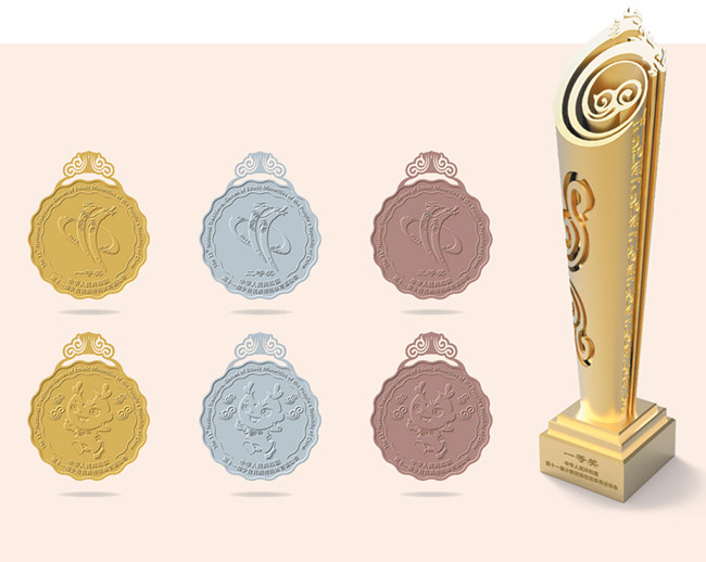 獎(jiǎng)杯《龍鳳書卷》,靈動(dòng)而不失莊重。獎(jiǎng)杯上端外觀基于會(huì)徽核心圖形“龍鳳”,具有較高的辨識(shí)度。龍鳳組成“11”圖案,呈相依相伴騰飛之勢,中間升騰古老的祥云圖案,彰顯中華文明生生不息的活力。獎(jiǎng)杯底座由三級(jí)臺(tái)階組成,寓意“三個(gè)離不開”(漢族離不開各少數(shù)民族,各少數(shù)民族離不開漢族,各少數(shù)民族之間也互相離不開)思想和步步高的美好祝福,激勵(lì)運(yùn)動(dòng)員奮力拼搏。