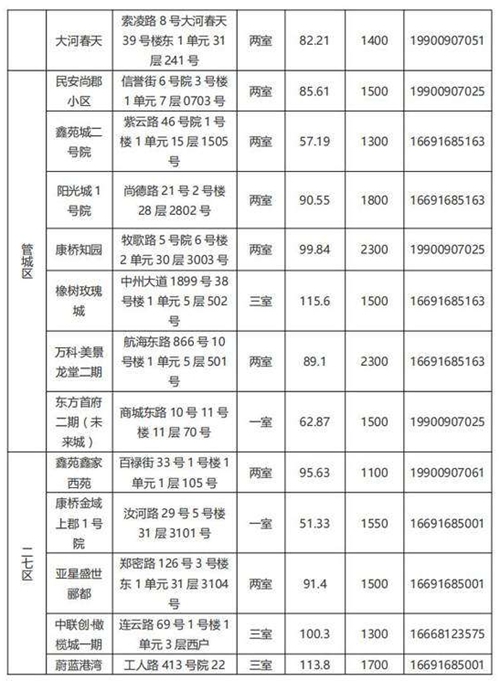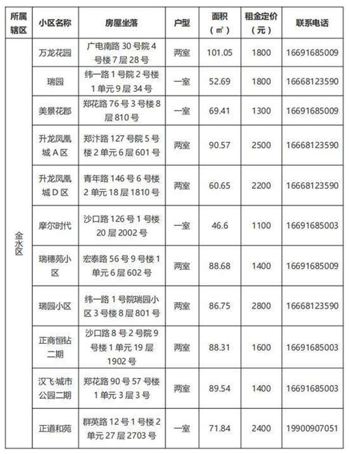 本批次配租房源共計32套,其中金水區(qū)12套、管城區(qū)7套、二七區(qū)8套、中原區(qū)1套、鄭東新區(qū)3套、惠濟區(qū)1套。水電費均為民用水電標準,物業(yè)費為各小區(qū)物業(yè)收費標準,房源精裝修交付,周邊配套設(shè)施齊全,配備家具家電,拎包入住,后續(xù)房源將根據(jù)裝修進度情況陸續(xù)配租。