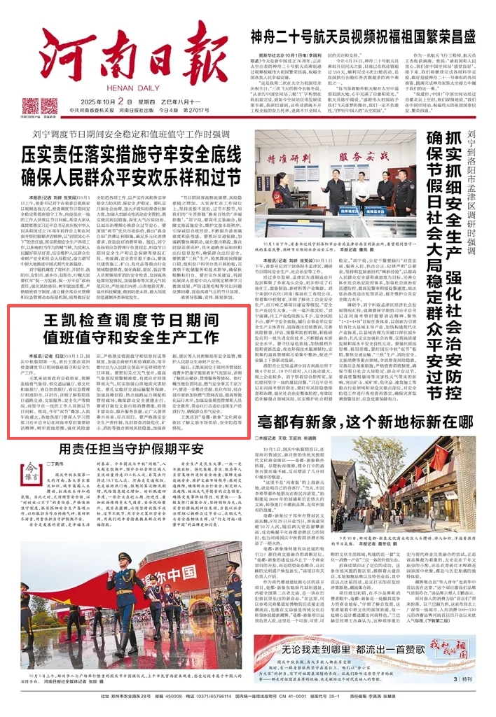 王凱來到省政府總值班室,視頻連線省氣象局、省交通運(yùn)輸廳、省文化和旅游廳、省自然資源廳、省應(yīng)急管理廳和洛陽市、開封市,詳細(xì)了解假期首日道路交通、文旅服務(wù)、安全生產(chǎn)等情況,向堅(jiān)守在一線的工作人員致以節(jié)日問候。他說,今年“雙節(jié)”疊加,人流車流量大,各地各部門要深入學(xué)習(xí)貫徹習(xí)近平總書記在河南考察時(shí)重要講話精神,樹牢底線思維,強(qiáng)化風(fēng)險(xiǎn)意識,嚴(yán)格落實(shí)值班值守和信息報(bào)送等制度,加強(qiáng)會商研判和協(xié)調(diào)聯(lián)動,用辛勤付出為人民群眾創(chuàng)造平安祥和的節(jié)日環(huán)境。要密切關(guān)注天氣變化,提高氣象預(yù)報(bào)預(yù)警精準(zhǔn)度,有效應(yīng)對持續(xù)降雨天氣,切實(shí)加強(qiáng)山洪地質(zhì)災(zāi)害防范。要扎實(shí)做好交通運(yùn)輸服務(wù)保障,加強(qiáng)高峰時(shí)段、熱點(diǎn)線路運(yùn)力調(diào)配和管控疏導(dǎo),確保群眾安全便捷出行。要更好激發(fā)文旅市場消費(fèi)潛能,持續(xù)豐富業(yè)態(tài),提升服務(wù)質(zhì)量,讓廣大游客乘興而來、盡興而歸。要嚴(yán)格落實(shí)安全生產(chǎn)責(zé)任制,及時(shí)排查消除?;?、礦山、消防等重點(diǎn)領(lǐng)域風(fēng)險(xiǎn)隱患,加強(qiáng)商超、景區(qū)等人員密集場所安全監(jiān)管,維護(hù)人民群眾生命財(cái)產(chǎn)安全。
