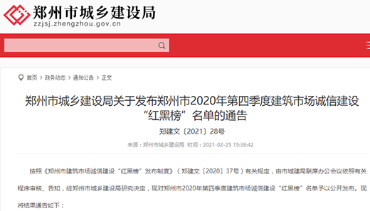 2月25日,鄭州市城鄉(xiāng)建設(shè)局發(fā)布鄭州市2020年第四季度建筑市場誠信建設(shè)“紅黑榜”名單的通告(鄭建文〔2021〕28號),鄭州地產(chǎn)集團投資管理有限公司榮登“紅榜”單位,趙玨榮登“紅榜”個人。