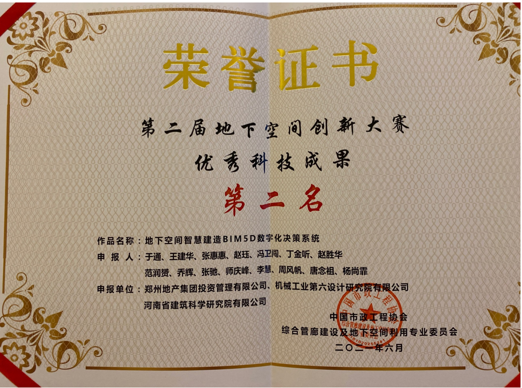 日前,鄭州地產(chǎn)集團投資管理公司參賽作品《地下空間智慧建造BIM5D數(shù)字化決策系統(tǒng)》榮獲“全國地下空間創(chuàng)新大賽優(yōu)秀科技成果”第二名。